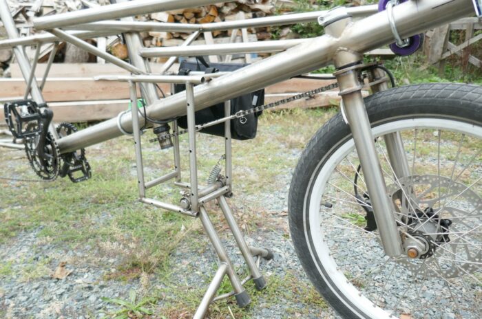 ca rejoint les problemes de béquille de la plupart des biporteurs à plate forme haute, c est souvent précaire et il faut soulever la roue. La probleme a bién été étudié à Montauban. super solution avec buté pneu toute douce et marche pied enfant.