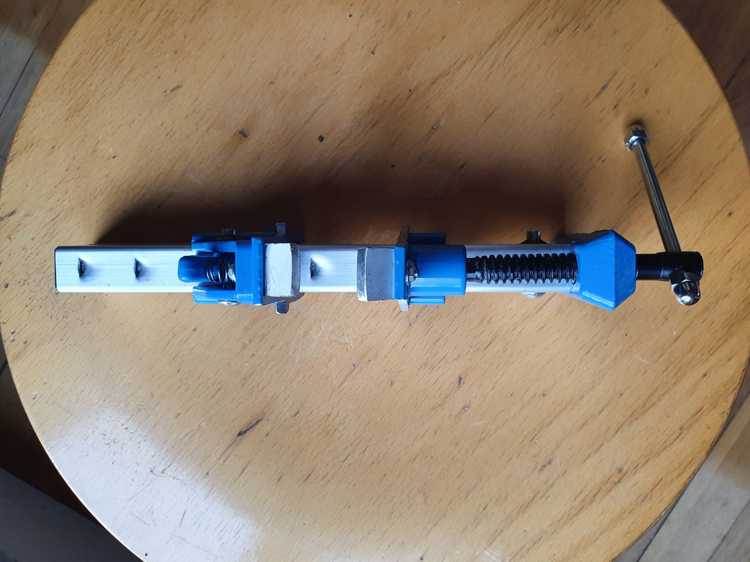 donc j'ai fait ca avec un serre joint a dormant raccourci que j'ai modifie et adapté 2 petits L d'alu recupere sur des supporst de tringle a rideau en alu "butchered" - me demander pas pourquoi il est a l envers ! la photo veut pas se charger a l endroit ...